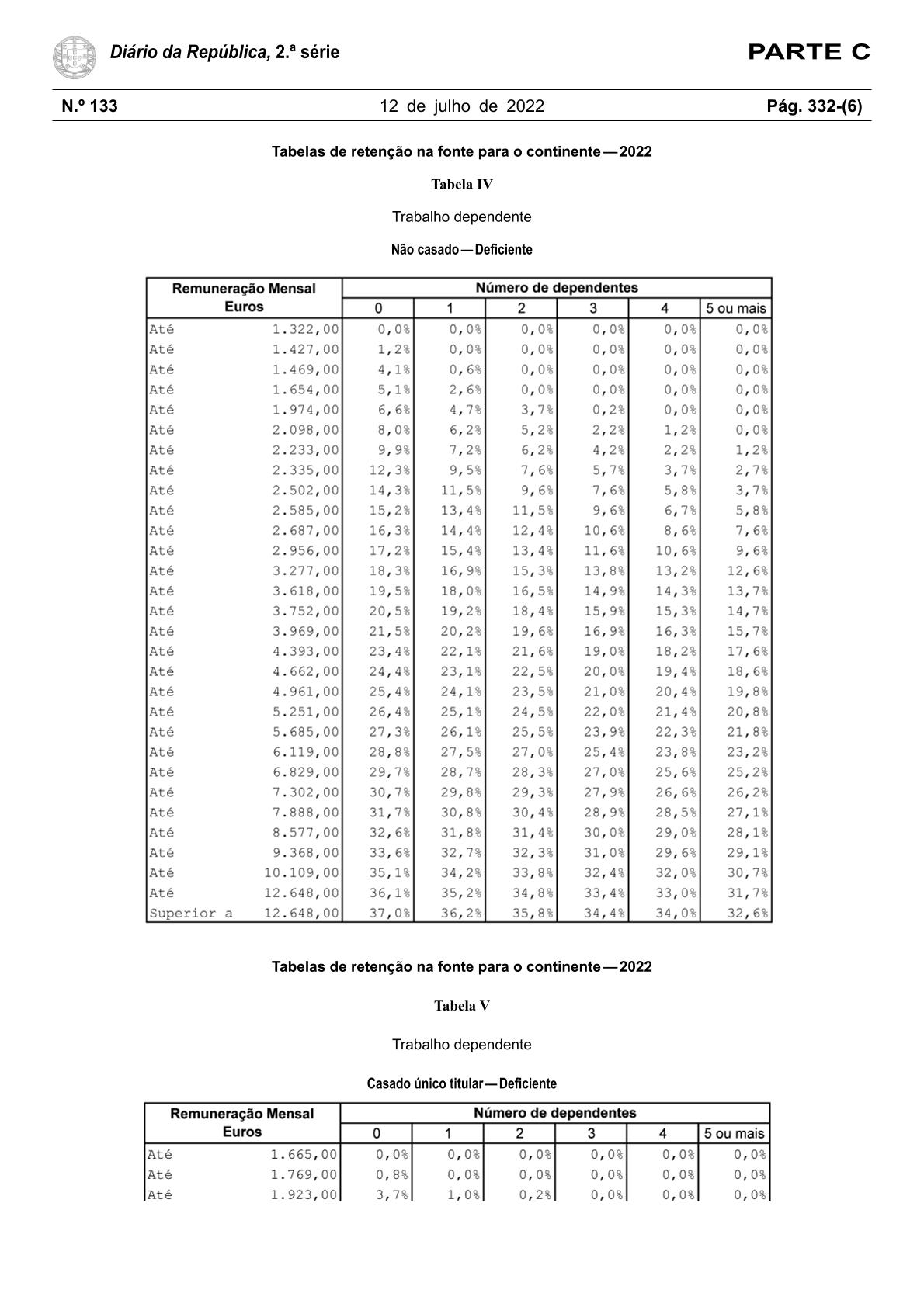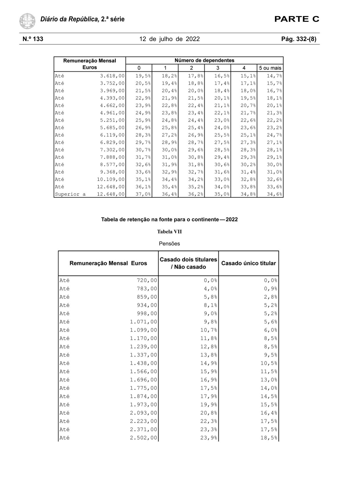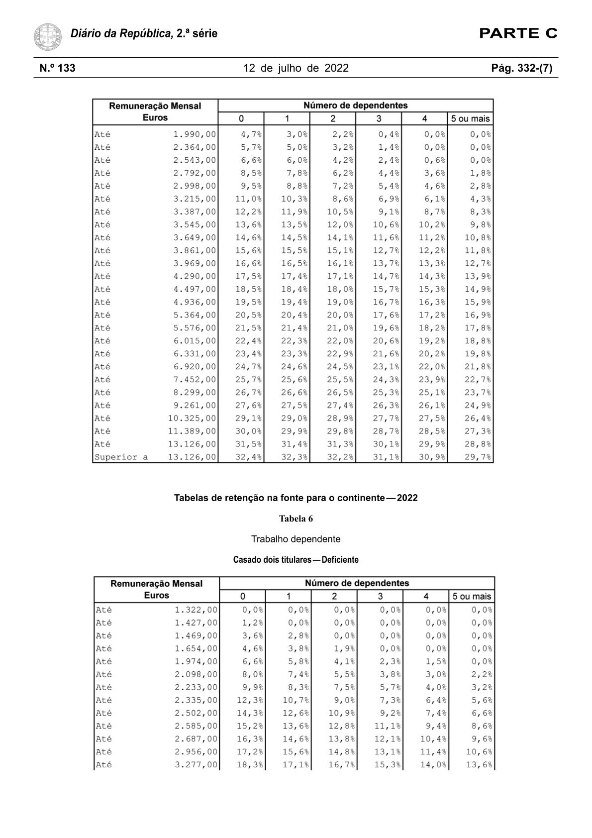 Aprova as alterações às tabelas de retenção na fonte, que se encontram em vigor para o continente no ano de 2022, relativamente aos rendimentos de trabalho pagos ou colocados à disposição a partir de 1 de julho de 2022.