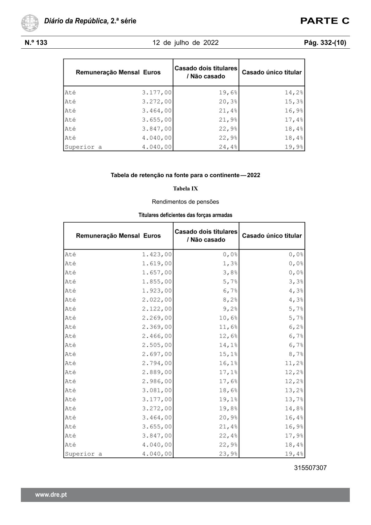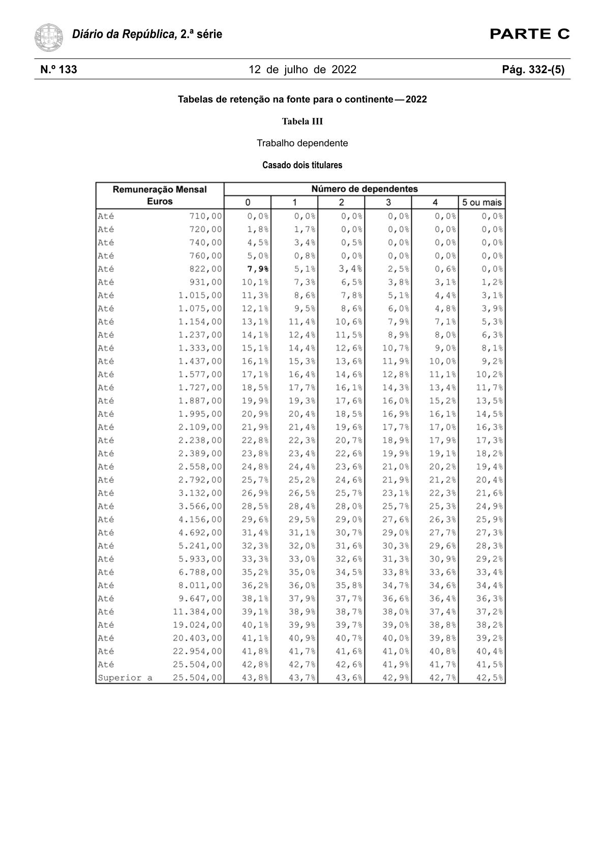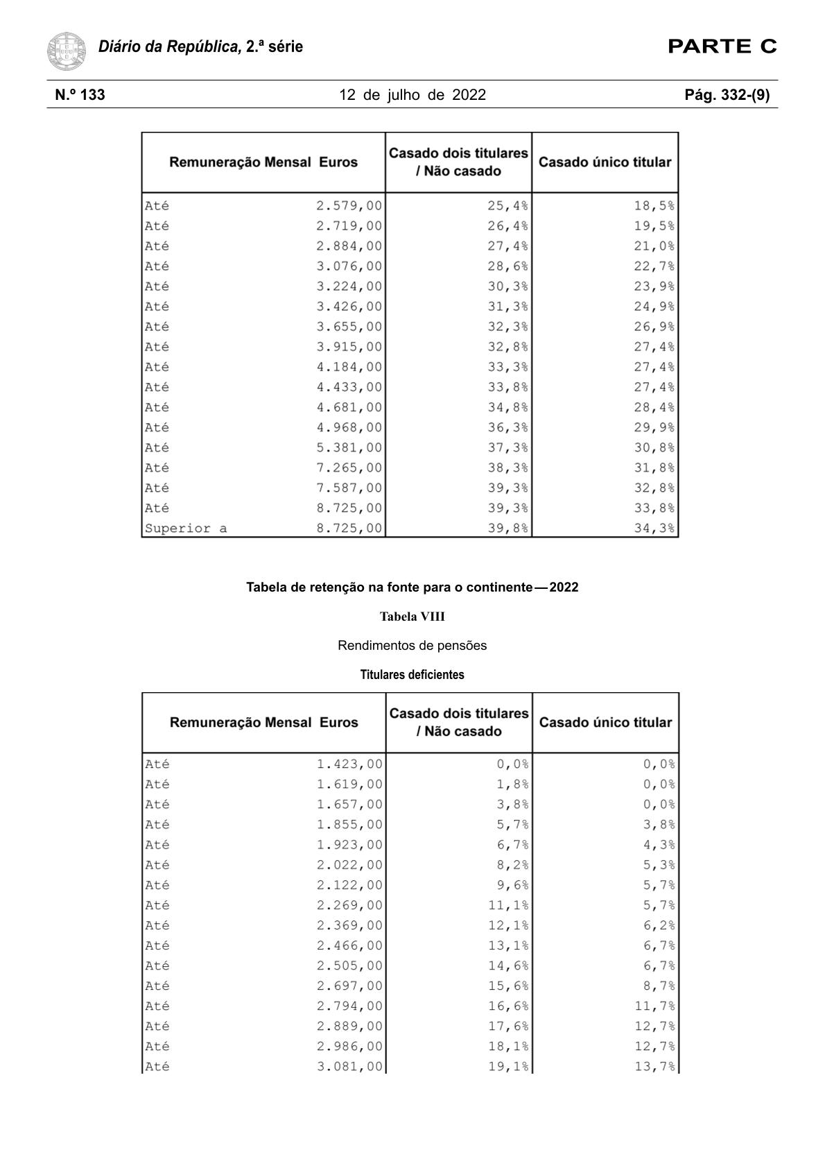 Aprova as alterações às tabelas de retenção na fonte, que se encontram em vigor para o continente no ano de 2022, relativamente aos rendimentos de trabalho pagos ou colocados à disposição a partir de 1 de julho de 2022.