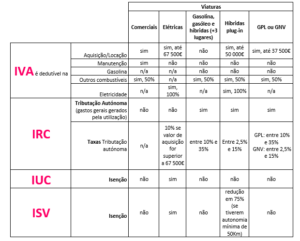 Quanto às viaturas ligeiras de passageiros, a dedução do IVA na aquisição vai depender conforme o combustível consumido pela mesma. No caso de viaturas Híbridas plug-in, o IVA suportado aquando da aquisição ou locação do veículo é dedutível se o custo do mesmo não ultrapassar o valor de 37 500,00€ + IVA. Já nas viaturas movidas a GPL ou a GNV, podem deduzir 50% do IVA suportado na aquisição/locação, desde que o valor de compra do automóvel não seja superior a 37 500,00€ + IVA. Em termos de viaturas 100% elétricas, o sujeito passivo pode usufruir da dedução total do IVA suportado na aquisição ou locação do mesmo. Se falarmos de viaturas ligeiras de passageiros movidas a gasóleo, gasolina ou híbridas (+ de 3 lugares), o IVA pago aquando da aquisição do automóvel não é dedutível na esfera da entidade que o adquire.